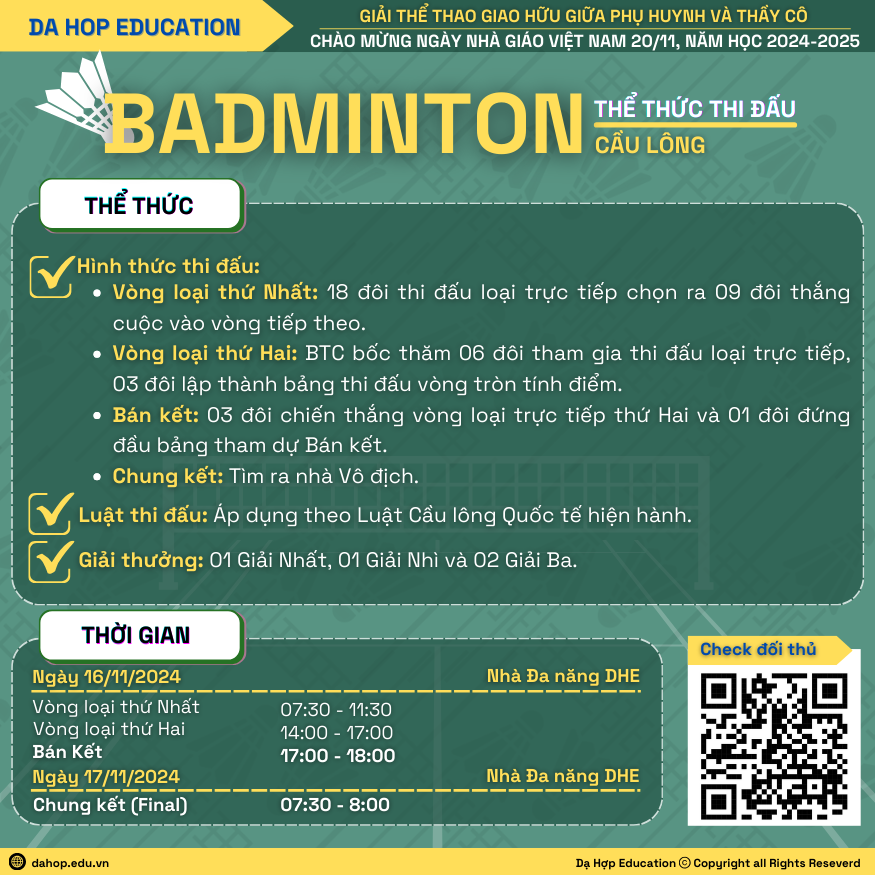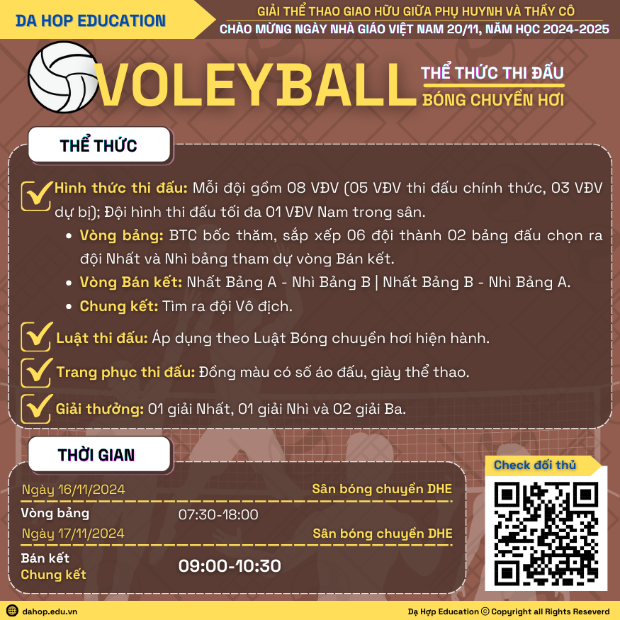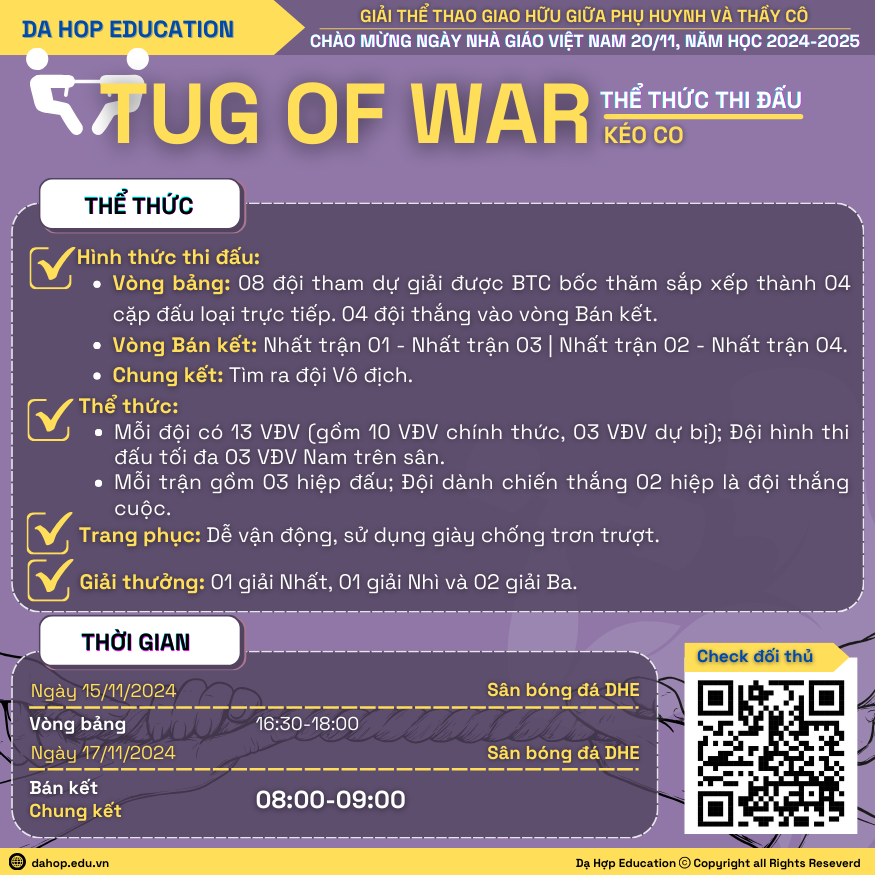 Ngày Nhà giáo Việt Nam 20/11 là một ngày Lễ trọng đại không chỉ đối với các thầy cô, các em học sinh mà còn đối với người dân trên khắp cả nước. Hòa chung trong không khí tưng từng, phấn khởi của Ngành Giáo dục nhằm Kỉ niệm 42 năm Ngày Nhà giáo Việt Nam (20/11/1982 và 20/11/2024); để tăng cường sự gắn kết, đoàn kết và tình cảm giữa Phụ huynh học sinh và thầy cô giáo, đồng thời tạo sân chơi để quý phụ huynh học sinh cùng thầy cô giáo DHE có dịp giao lưu, vui chơi và rèn luyện sức khỏe.