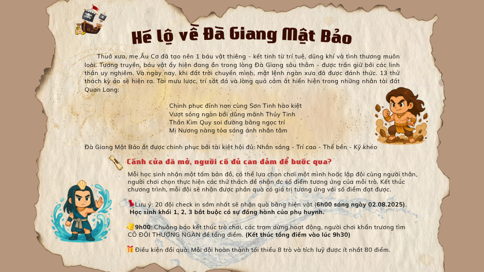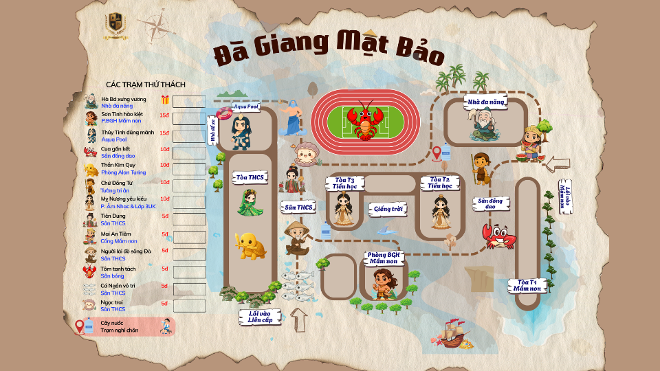 Hội hè Đà Giang Mật Bảo 2025 là sân chơi trải nghiệm độc đáo dành cho học sinh, được tổ chức với mục tiêu rèn luyện kỹ năng, khơi dậy tinh thần khám phá và gắn kết cộng đồng. Diễn ra trong không khí sôi động và sáng tạo, chương trình mang đến hơn 10 thử thách hấp dẫn, kết hợp vận động – trí tuệ – nghệ thuật, giúp các em học sinh phát huy sự tự tin, tinh thần đồng đội và khả năng ứng biến linh hoạt. Với chủ đề mang đậm màu sắc huyền thoại và dân gian, “Đà Giang Mật Bảo” không chỉ là một ngày hội, mà còn là hành trình tìm kiếm kho báu trong chính trái tim và nụ cười tuổi thơ.